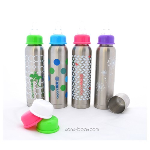 Inox 18/8 double paroi sous vide, ISOTHERME.Goulot étroit standard.Tétine silicone vitesse rapide (6 mois et plus).Bague PP#5 sans BPA et autres toxines & pas-de-vis inox.Capuchon verre mesureur gradué inox 18/8.