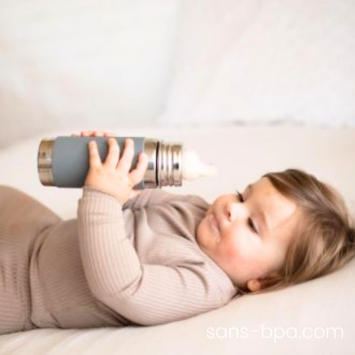 Inox 18/8 double paroi ISOTHERME.Goulot large standard.Bague PP#5 sans BPA et autres toxines. Capuchon verre mesureur gradué inox 18/8.Inclus : poignée & capuchon colorés plastique PP#5 sans BPA + 3 tétines silicones débit lent-médium-rapide + 1 bec à boire silicone anti-fuite.