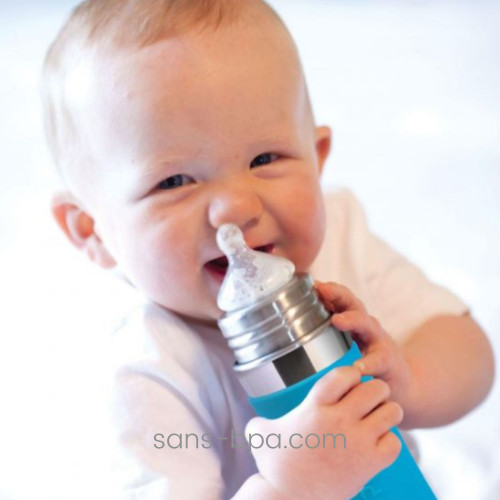 Inox 18/8 double paroi ISOTHERME.Goulot large standard.Bague PP#5 sans BPA et autres toxines. Capuchon verre mesureur gradué inox 18/8.Inclus : poignée & capuchon colorés plastique PP#5 sans BPA + 3 tétines silicones débit lent-médium-rapide + 1 bec à boire silicone anti-fuite.