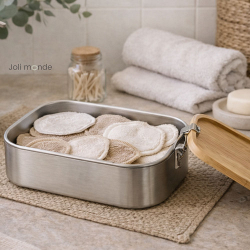 Son couvercle en bambou ajoute douceur et harmonie à cette boite qui devient un joli objet de décoration à la cuisine ou salle de bain.