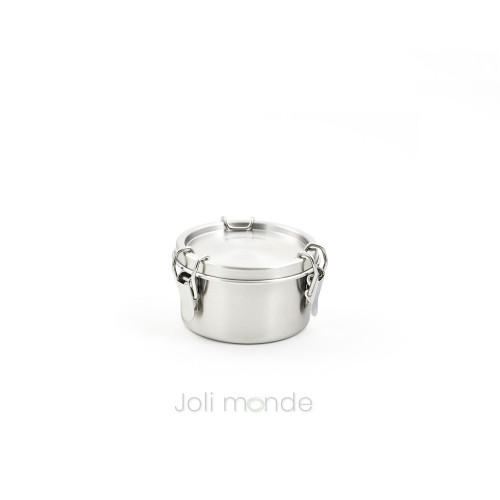 Boite inox étanche La Retro Petite . Diam 10cm - JOLI MONDEUne bonne alternative aux boîtes plastiques, La qualité zéro plastique, PAI, Gigognes100% inox 18/8 & joint silicone.Contenant étanche . Joint silicone amovible.Fermeture 3 points crochets inox.Diamètre 10cm . Hauteur 6.5cm . Contenance 400ml . Poids 175g.