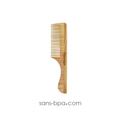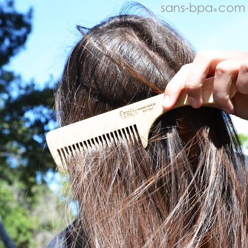 Ce peigne, composé de deux sections de bois à veines opposées, peut être utilisé également sur cheveux humide sans endommager sa structure.