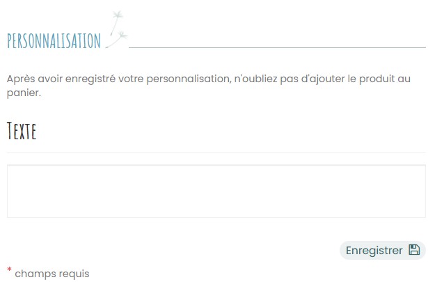 Pour cela, indiquez le prénom de votre enfant dans l'espace Personnalisation que vous verrez apparaitre en faisant défiler tout en bas cette page (cliquez sur enregistrer puis ajoutez le produit dans le panier) :