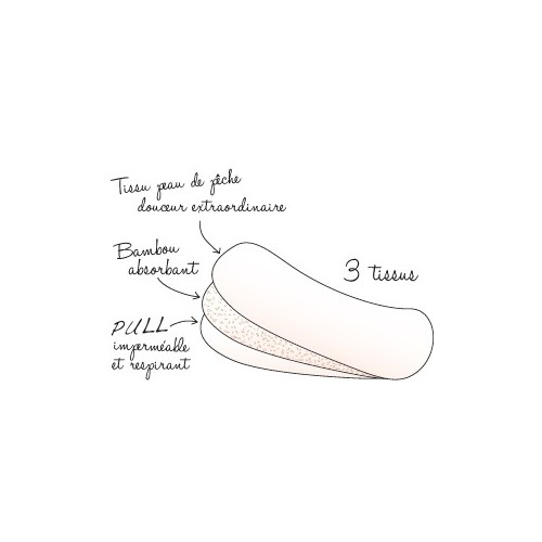 Bambou, tissu de pêche polyester et PULL.Lot de 3 protège-slip : Longueur 16 cm . Largeur ouvert 12.5 cm . Largeur une fois plié 2 positions 4cm et 5 cm.+ filet de lavage coton Bio + trousse tissu de rangement.