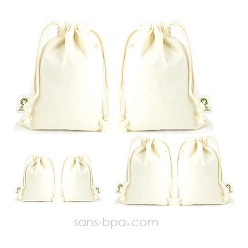 Coton BIO maille tissée.Fermeture double lien coulissant.Taille 10 x 14cm . Poids 5g.Vendu à l'unité.
