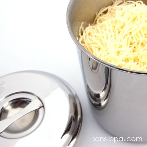 100% inox 18/8.Contenant non étanche.Diamètre 14.5 cm . Hauteur 16.5 cm . Contenance 2200ml . Poids 400g.