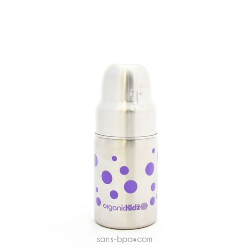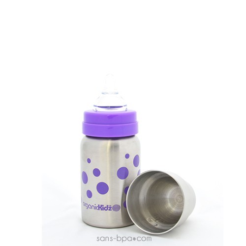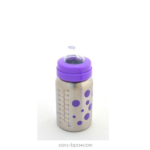 Inox 18/8 simple paroi de haute qualité médicale.Goulot large standard.Tétine silicone vitesse rapide (6 mois et plus).Bague PP#5 sans BPA et autres toxines.Capuchon verre mesureur gradué inox 18/8.