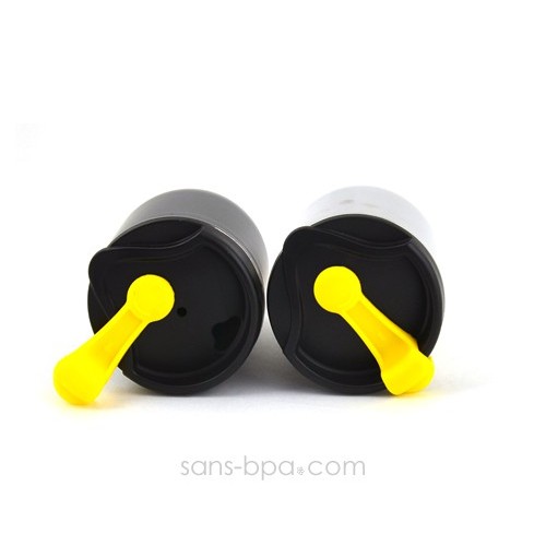 Couvercle plastique PP#5 & joint silicone (étanche mais non anti-fuite).
