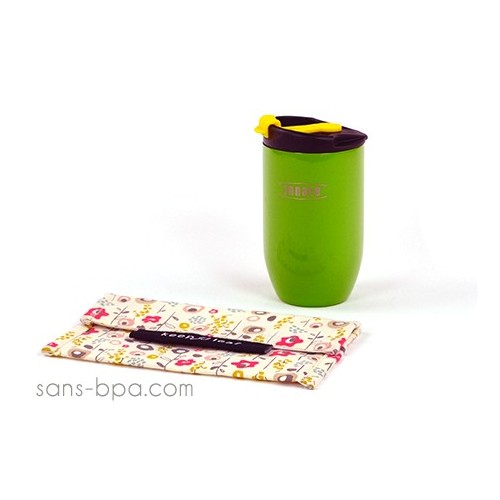 Timbale inox 18/8 double paroi sous vide, isolée.Couvercle plastique PP#5 & joint silicone (étanche mais non anti-fuite).Hauteur 11.5 cm . Diamètre 7 cm . Contenance 240ml . Poids 150 g