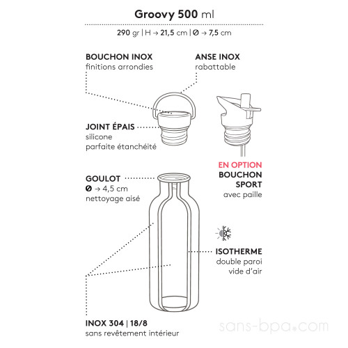 Gourde inox 500ml isotherme GROOVY - PLUME VERTE - GASPAJOE