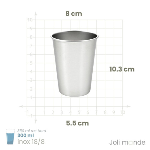 Hauteur 10.3 cm . Diamètres 8 cm / 5.5 cm . Contenance 300 ml. Poids 70 g