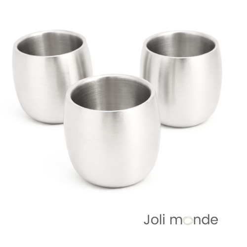 En inox double paroi, sans revêtement de résine d'époxy* : il permet de ne pas se brûler les doigts si la timbale doit contenir une boisson chaude, et maintiendra le liquide chaud plus longtemps.