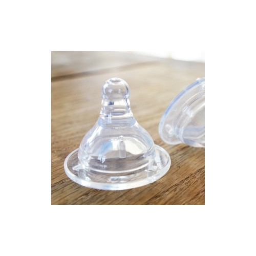 Tétines silicone péristaltiques à débit d'air contrôlé.Goulot large. Débit lent.Pour nourrisson de 0 à 3 mois.Diamètre 5 cm . Hauteur 4 cm.Vendues par lot de 2.