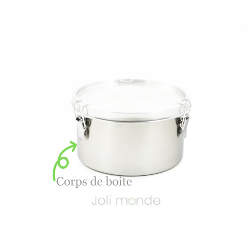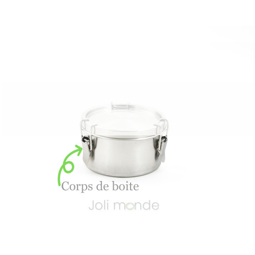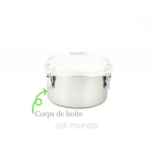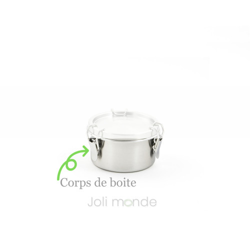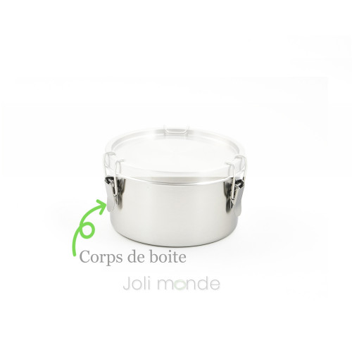 Boite inox étanche La Retro Petite . Diam 10cm - JOLI MONDEUne bonne alternative aux boîtes plastiques, La qualité zéro plastique, PAI, Gigognes100% inox 18/8 & joint silicone.Contenant étanche . Joint silicone amovible.Fermeture 3 points crochets inox.Diamètre 10cm . Hauteur 6.5cm . Contenance 400ml . Poids 175g.