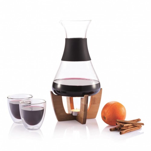 Ensemble comprenant 1 carafe verre + 2 tasses verre souble paroi + 1 support bambou + 1 bougie réchauffe-plat.